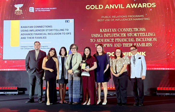 BDO Unibank earned a Gold Anvil Award for its “Kabayan Connections” campaign at the 61st Anvil Awards, under the Public Relations Programs – Best Use of Influencer Marketing category.